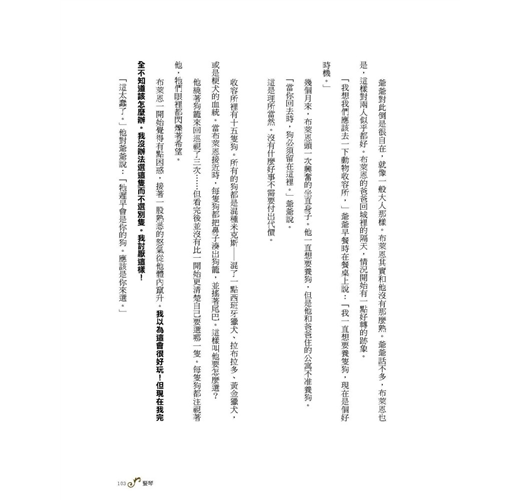 布萊恩把頭撇開,瞪著地板。他最恨有人說「我不在乎。」聽到這句話總是讓他忍不住想大吼:「不在乎!你為什麼不在乎?」就好像有太多的事物人們一點都不在乎,就像這些狗一樣……