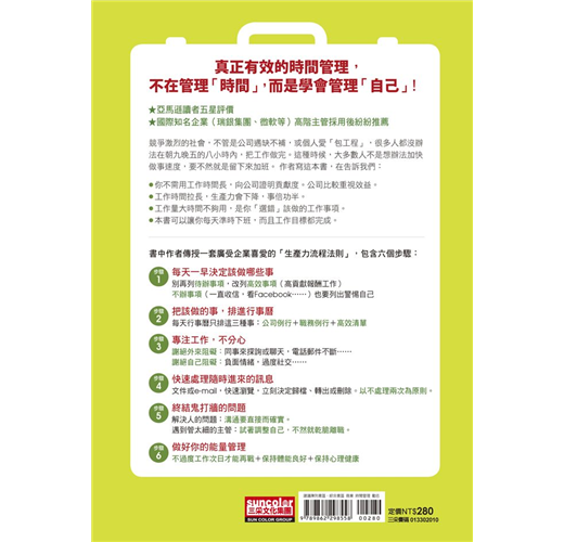 「這是一本內容豐富、務實的工具書,你可以在本書中一覽現代職場上最困難的挑戰:時間管理。終於有人能夠解決我們工作過勞的窘境,作者史塔克女士也給予我們相當有用的解套公式:精簡、精簡、再精簡。」