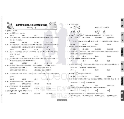 國文‧英文‧電腦概論‧數學‧公民‧捷運常識,每科5回,每回40題