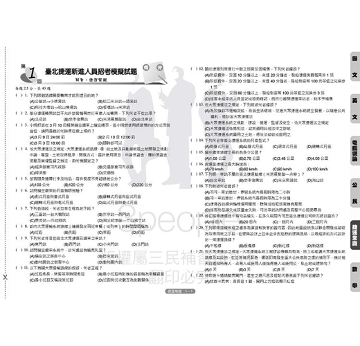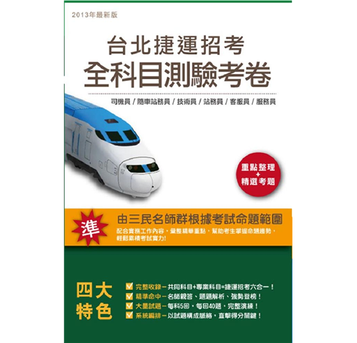 台北捷運招考全科目測驗考卷【適用司機員、隨車站務員、技術員、站務員、客服員、服務員】,測驗卷涵蓋捷運招考各考科:國文、英文、電腦概論、公民、數學及捷運常識,每科5回,每回40題,大量演練+熟悉題型=獲取高分!