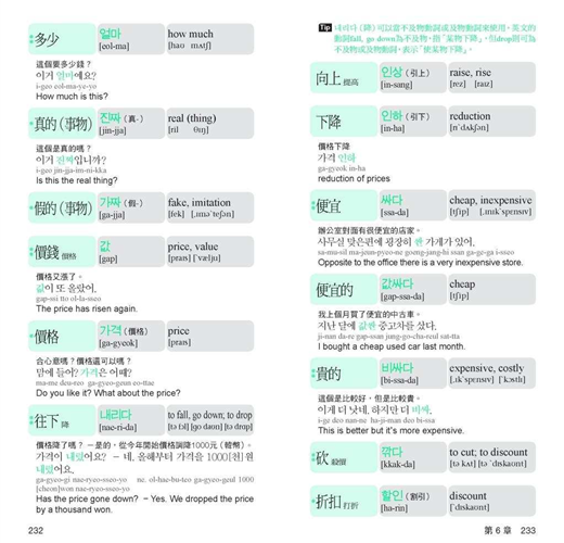 韓文與英文皆標註一看就會唸的羅馬拼音、音標。韓文中部分單字有漢字與外來語。漢字十之八九發音與中文相似,進而協助讀者善用母語優勢,快速學成;韓文中的外來語由於大部分來自英文,其發音有七成相似,讓只有英文基礎者對韓文產生印象。