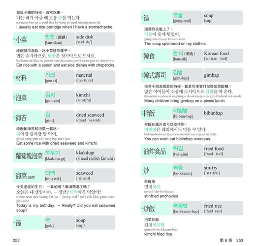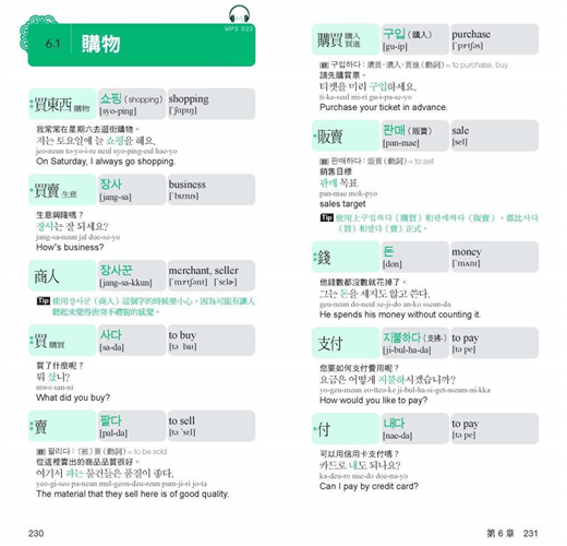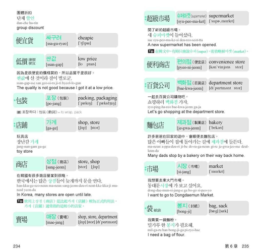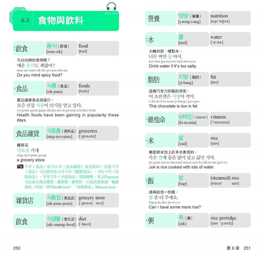 單字方塊下方的衍生字主要告訴讀者詞類變化,提示解說(Tip)包含了聲調、語意差別、語言與文化差別、用法等等實用資訊。例如,英文的「隱形眼鏡」,通常會直接用contacts來取代contact lenses,但在韓文,他們則用ren-jeu(借用英文lens)來意指「隱形眼鏡」。英文appetite是指食慾的意思,但在韓國講bam-mat(食慾)還可意指「討厭的人」!英文的yard和garden,韓文的tteul和jeong-won都有「庭院」的意思;英文的goods、product、commodity都有「產品」的意思,但你知道這些差別是什麼嗎?翻開本書都有答案。