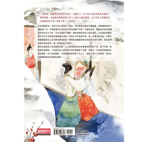 文怡初臨京城,長房大伯父便發生了變故,原已勝券在握的升職機會,被無權無勢的下屬給搶了去。京裡這會兒又因為皇子們的婚事不平靜,文慧的好友、鄭貴妃的侄女鄭麗君本是內定太子妃,但太后嫌其不穩重,屬意東陽侯家的小姐杜淵如,太后跟前得寵的東平王世子朱景誠亦屬意娶杜淵如,文慧又非朱景誠不嫁,這一池春水亂又亂。文慧本想藉鄭麗君金口成功與朱景誠結親,哪裡知道鄭麗君對朱景誠早已暗生情愫,前世如膠似漆的姐妹感情,這一世會因皇子生變?