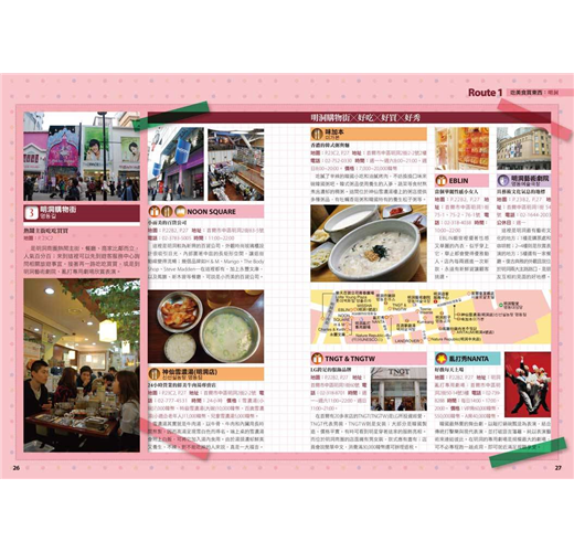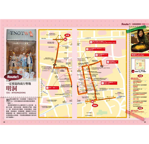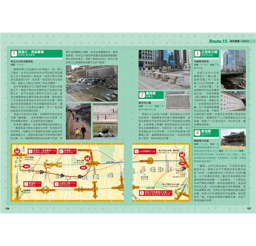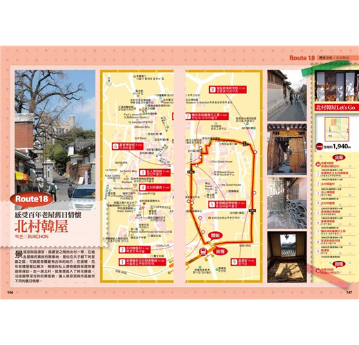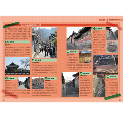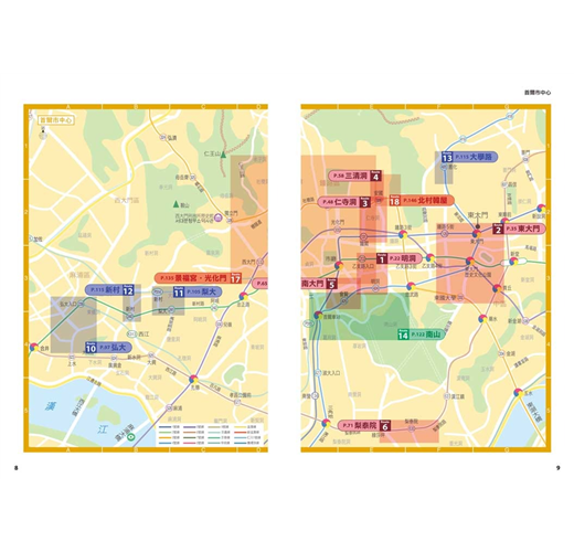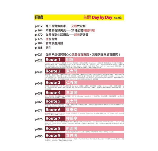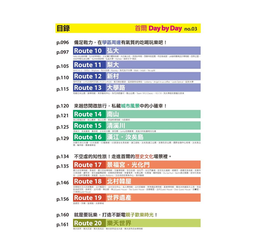 其中,在「美食購物」主題單元,即規畫明洞、東大門、仁寺洞、三清洞、南大門、梨泰院、狎鷗亭、新沙洞、文井洞等地路線,「大學風光」單元帶你到弘大、梨大、新村、大學路等地吃喝玩樂,在「城市風景」單元,則帶你到南山、清溪川、漢江、汝矣島等地,透過纜車、步行或坐船的方式,引領這個地方的城市之美;對「歷史文化」有興趣的人,景福宮、光化門、北村一帶的景點、博物館和韓屋,必定能讓你收穫滿滿,此單元並同時教你如何在同一天,用最便捷的方式造訪首爾的世界遺產;在「歡樂時光」單元,當然是要到最適合全家同樂的樂天世界玩樂和購物。