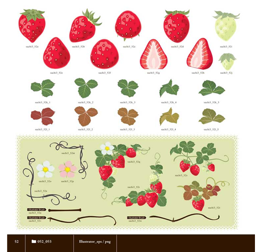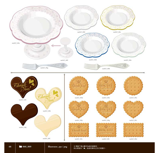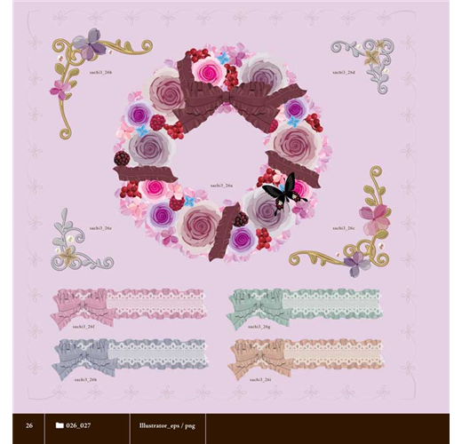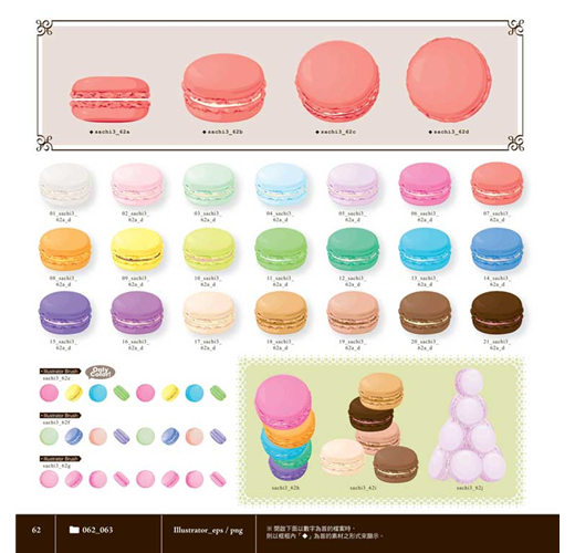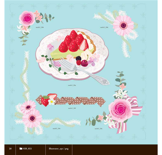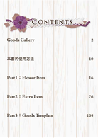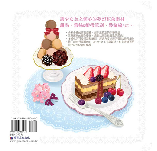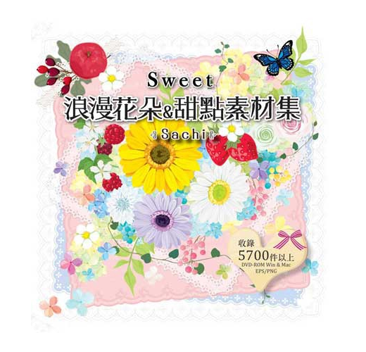 *共收錄5700個以上浪漫風格的花朵&甜點素材,從各種花草圖案、果實配件、甜點種類,到邊框、蕾絲、緞帶等,全都可以合法應用(詳細授權範圍請見書籍內頁)。