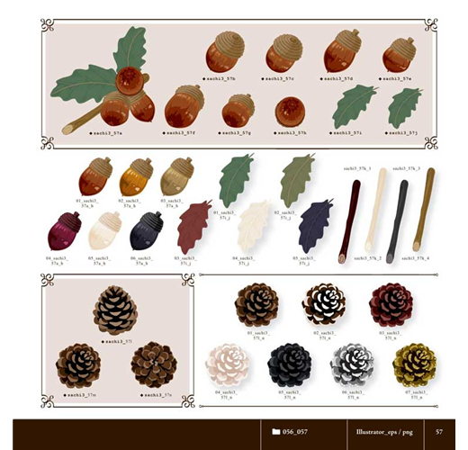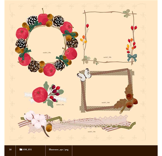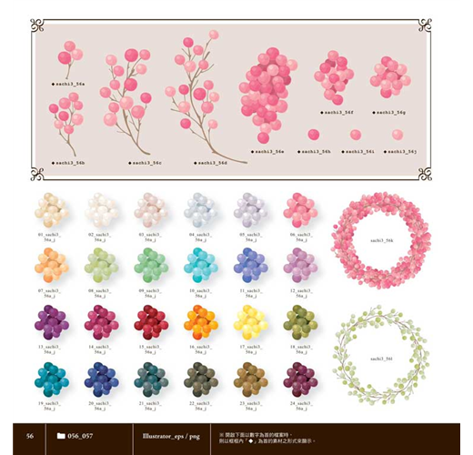 多色玫瑰、薔薇,小雛菊、波斯菊和勳章菊,軟棉棉質感的錦葵棉花,以及運用珍珠搭配設計的迷人槐花。每一種花朵都以不同層次的色彩設計,即使是原創的向量圖形,從花蕊到花瓣的細節,也都經過細膩的色調處理,營造出唯美浪漫的柔和氣息!另外也搭配些許青綠的葉片、藤蔓,以及櫻桃、莓果、松果等不同季節的果實,增加豐富度。每種素材幾乎都配有不同角度和色調可選用,精緻得令人讚嘆不已!