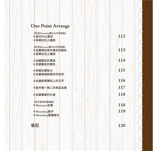 *本書提供詳細的使用方法,從Adobe Illustrator到Photoshop,清楚介紹修改素材與使用筆刷特效的設定,一種素材可以變化出更多樣的效果。