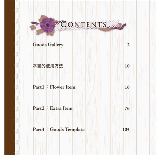 *本書以花朵&甜點為主題,收錄各種不同品種的花朵,以及各種不同口味的午茶點心,而每一種花朵和甜點也都提供不同角度、不同色系的設計,讓你隨意選用!