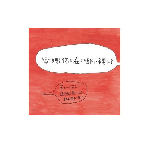 這本書的催生過程是,兒子出生後,遠流編輯打了電話來詢問,「之後想不想嘗試畫給小孩的繪本?」過了一年,和兒子的互動越來越多後(之前他多半躺著,也不會應答),他時時刻刻惦記著、隨時問媽媽在哪裡,最近又迷上能發出聲音的車子,因此給了我創作這本《媽媽在哪裡?》的靈感。想像同樣一種聲音從不同方向翻閱,在門後等待的小孩有著截然不同的答案。我想,「媽媽在太空修理機器」對大人來說是超現實的,但在小小孩的腦袋裡說不定會覺得這是可能的。