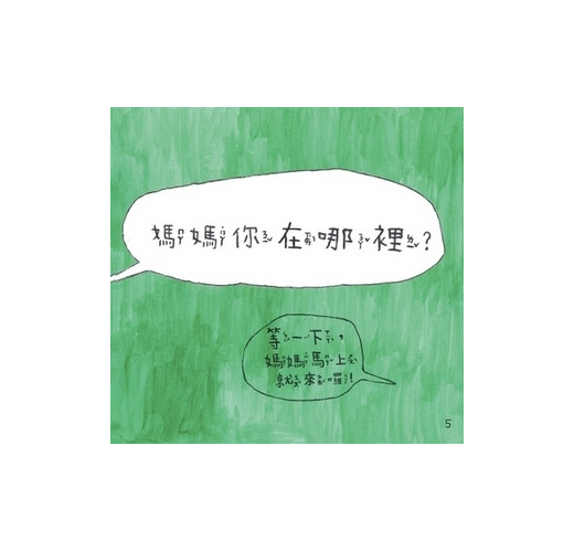 小男孩早上起床,沒看到媽媽,他問:「媽媽你在哪裡?」媽媽說:「等一下,媽媽馬上就來囉!」然後小男孩在等待的過程中,一邊聽著房門外的各種聲音,一邊猜想媽媽正在做什麼。同樣的聲音線索,從左翻起是一種猜想,從右翻起卻呈現截然不同的答案──前者描繪的現實生活場景,如客廳、廚房、浴室等,能與孩子的日常經驗產生聯結;後者天馬行空的奇想,如外太空、叢林,馬戲團等,讓孩子的想像力盡情揮灑馳騁!