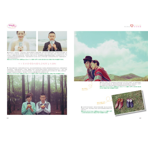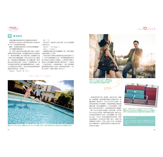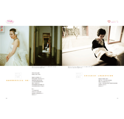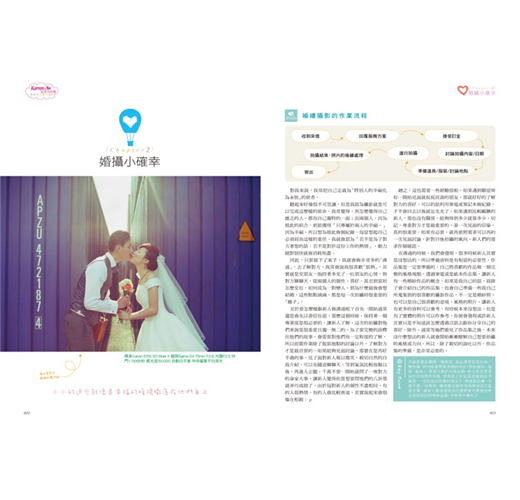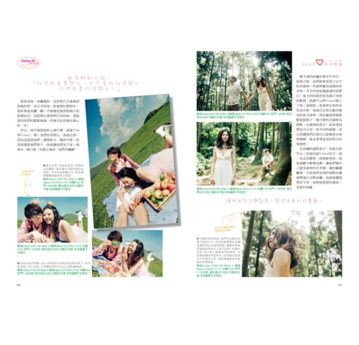 如何巧妙地把「風格」、「創意」、「幸福」、「婚紗」、「故事」、「攝影」、「教學」等幾個元素結合在一起,是製作本書時的一大挑戰。然而,透過Karren自然又感性的文字,搭配上美麗的影像,讓整本書閱讀起來,成為一種難以言喻的「享受」。