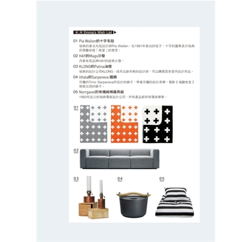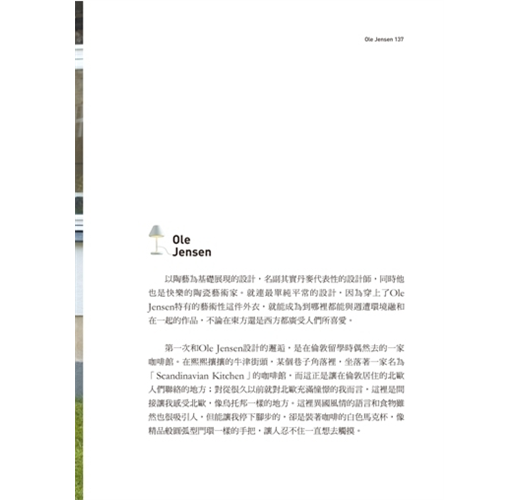 首先是在丹麥與以詼諧的設計引領潮流,個性樂天的Claydies和花樣熟男Ole Jensen、以及害羞的夫婦設計師GamFratesi見面。接著是和《海鷗食堂》裡的三個旅人一樣,滿足於slow life的芬蘭設計師Liisa Jokinen和Maija Louekari。最後是北歐中心瑞典的可愛太太Ingela P Arrhenius,和享受庭園生活的Emma Fexeus,以及像老師一樣,說明時簡單明瞭的Lotta Odelius……。直接訪談的這八位北歐設計師,他們有人是作家,有的是部落客,雖然各自有自己的生活,但全都是自然環保生活方式的愛好者。超越了時間、融合了時代,備受大家喜愛的北歐設計,其中的力量,正是來自於優遊自在的北歐生活方式裡。身處於比其他國家快速成長,競爭激烈的亞洲,能撫慰我們疲憊心靈的,不正是那單純、緩慢步調和親近自然的北歐設計嗎?