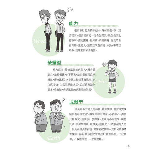 總之他認為參考本書做做測驗就可以知道自己是那一行了!他說像我這樣的火行人動力十足,是天生的火車頭,很有概念和理念,熱忱一起,就會衝衝衝,不喜歡別人反對自己的意見,當下不容易心甘情願的妥協;反之金行人是規矩人,做起事情來標準很高,火行人比較不据小節,大方向對就好,但金行人則是該怎麼做就怎麼做,一切都要照規定來,不容許有任何小節的誤差,如果一切沒有在計畫中就會十分緊張!