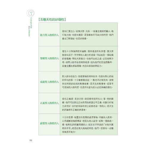 可貴的是,這本書本書更進一步,它具體的描述了個性改變療法,雖然理論源自於王鳳儀善人的五行講病理論與中醫,但是,名欽非常成功地將五行的金木水火土轉成「正義型」「能力型」「感覺型」「榮耀型」「成就型」的白話語詞,並且加上了他多年的臨床經驗,而結晶了這一本書。