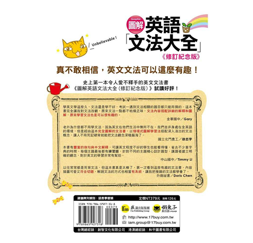 學英文學這麼久,文法還是學不好,考試一遇到文法有關的題目都只能用猜的。這本書完全讓我的文法改觀,原來文法一點都不枯燥乏味,搭配詳細的解釋和圖解,原來學習文法也是可以很有趣的。(金華國中/Gary Wu)