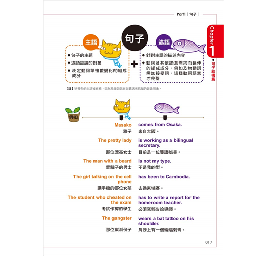 以往常常都是死背文法,但是這本書真是太棒了,第一次看到這麼有趣的文法書,內容插圖很可愛又符合切題, 解說文法的方式也相當有系統,讓我把複雜的文法都學會了。 (外商袐書/Doris Chen)