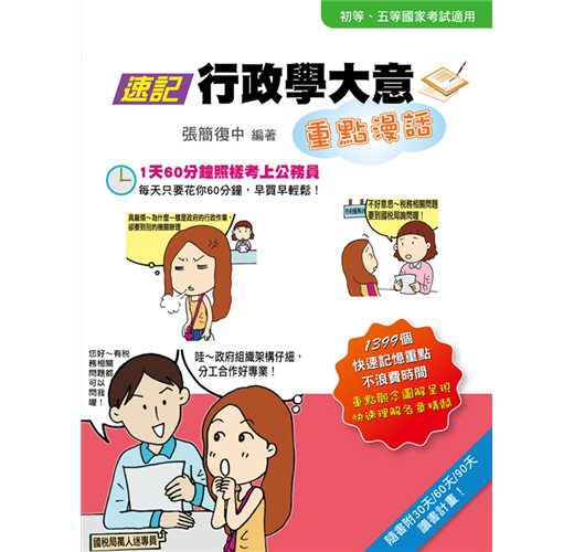 行政學大意,係以現行行政理論與實際流程交叉勾勒出的學科。本書以簡潔明確、深入淺出的方式介紹行政學的基本觀念,協助讀者迅速了解各章的基礎概念,每一章節除了內容整理之外,在章節的後段還附上「精選題庫」,讓考生在複習完各章重點後能即時演練,進而發現自己還不熟悉的地方。本書為作者累積十餘年教學經驗,融合學界各書之長,使行政學易讀易懂外,更具以下特色: