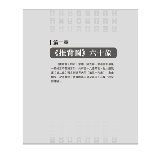 《推背圖》為中國古代著名預言書之一,相傳是唐•李淳風、袁天罡為推算唐朝國運,觀測天象,天感人應後,預測吉凶,形成一部堪稱神奇的預測典籍。亦有其一說為李淳風、袁天罡二人於晚年之時,進入神仙之界,優遊於山林之間,一日閒來無事,相背而坐,各顯神通,推演古往今來之盛事,一推前事,一推後事,你來我往,每推一事,便畫圖像一幅,寫幾句讖語和頌詞,故稱為《推背圖》。自古以來,《推背圖》有諸多版本,其言說之內容,並沒有明確指出具體的年代與每一個「象」所預測的事件,至目前為止,尚有些「象」,還沒有被解密出來。姑且不論此書作者是否為李淳風、袁天罡,或者其版本之真偽為何,從歷朝各代對它的重視程度而言,都不會影響《推背圖》作為「讖」之奇書的地位。