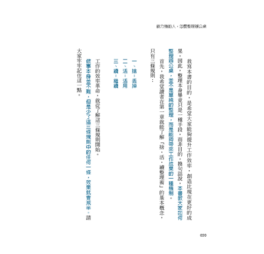 抱歉,我稍微兜了一個圈子。本書的內容就是介紹能為大家消除煩惱、提升工作效率的Know-how──工作能力強的人都在用的整理術,雖然書裡介紹的技巧很多,但規則只有三條: