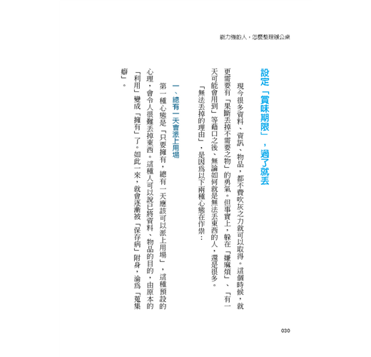 總之,丟東西的時候,不要用未來式「總有一天會派上用場」去思考,而是用過去式「過去幾個月有用上嗎」來思考。