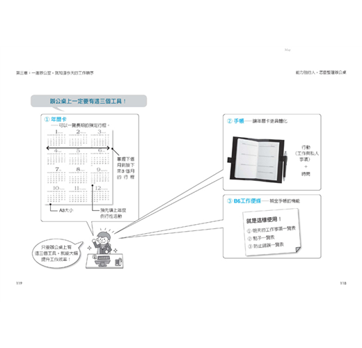 其次,作者壺阪龍哉針對桌面整理、檔案管理、名片管理,甚至手帳用法,分享了幾個讓工作更流暢的方法。這些方法看起來微不足道,實行起來也不困難,卻能達到很大的效果,幫你提升工作效率。例如:桌面就要像飛機跑道一樣淨空,只放正在工作中的東西,這樣可以保持專注力;抽屜文具收納整齊,且有固定位置,取用方便;很多人很頭痛的檔案管理問題,在本書中也介紹了簡單又很有用的方法,即使沒學過檔案管理的人也能輕易上手。