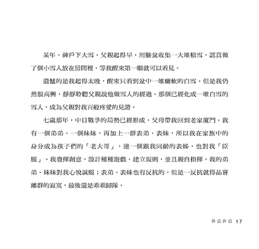 某年,神戶下大雪,父親起得早,用臉盆收集一大堆積雪,認真做了個小雪人放在房間裡,等我醒來第一眼就可以看見。
