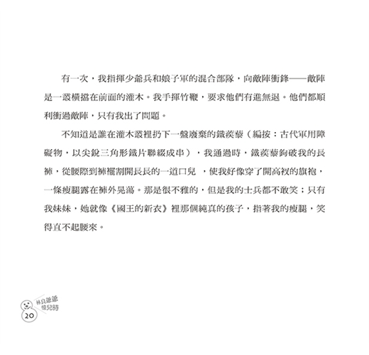 不知道是誰在灌木叢裡扔下一盤廢棄的鐵蒺藜(編按:古代軍用障礙物,以尖銳三角形鐵片聯綴成串),我通過時,鐵蒺藜鉤破我的長褲,從腰際到褲襬割開長長的一道口兒 ,使我好像穿了開高衩的旗袍,一條瘦腿露在褲外晃蕩。那是很不雅的,但是我的士兵都不敢笑;只有我妹妹,她就像《國王的新衣》裡那個純真的孩子,指著我的瘦腿,笑得直不起腰來。