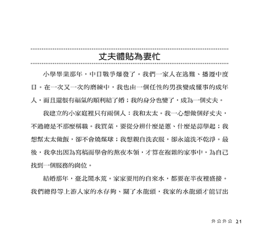 〈外公外公〉的來源,是編者問我的一句話:「你現在已經是一位外公了,有什麼感想?」這句話引發了我一連串的回憶。我寫下了我當「兒子」的感想,當「丈夫」的感想,當「父親」的感想,一直寫到自己寫「外公」的喜悅。