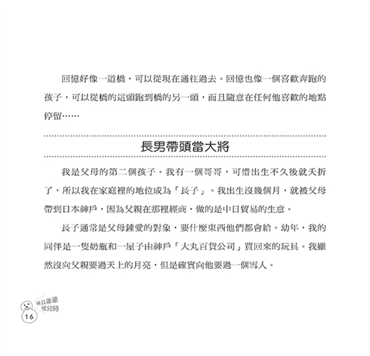 長子通常是父母鍾愛的對象,要什麼東西他們都會給。幼年,我的同伴是一隻奶瓶和一屋子由神戶「大丸百貨公司」買回來的玩具。我雖然沒向父親要過天上的月亮,但是確實向他要過一個雪人。