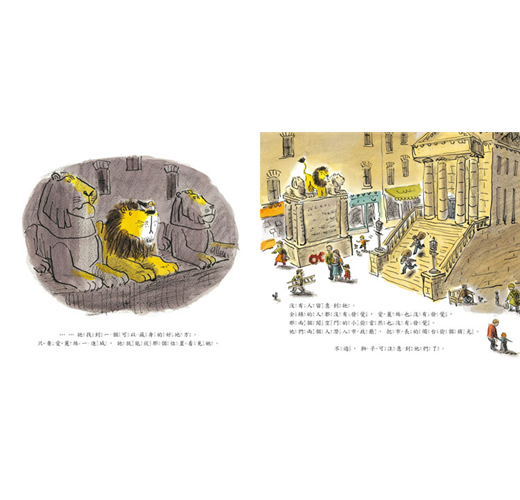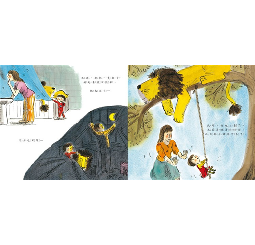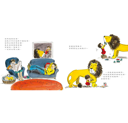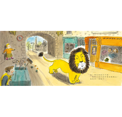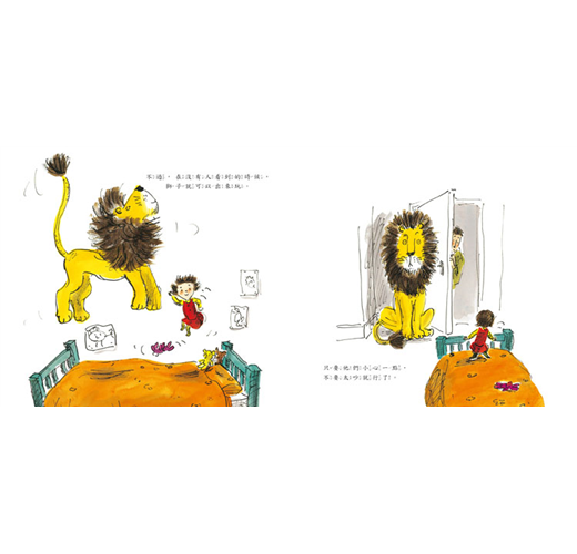 獅子危險嗎?或許吧,但如果有一隻溫和有禮貌的獅子出現在你面前,牠可以和你一起在床上彈跳,牠也喜歡聽你說故事,你會不會想要有一隻這樣的獅子朋友?這本書很快成為五歲兒子的最愛,每晚睡覺前他總是第一本就從書架上挑出這本書,要我再唸一遍。我們非常喜歡它的圖畫,不論是描繪屋子裡的各個角落,或是小鎮街道,處處溫馨美好!
