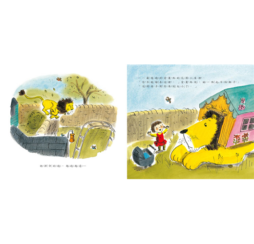 鎮上的人都很怕獅子,他們拿起掃把、擀麵棍…把獅子趕得遠遠的。獅子跑啊跑,跑到小女孩愛麗絲的花園裡。