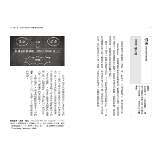 本書並不只有單純列出淺顯易懂的超譯譯文,為了避免讀者誤解,在充分說明詞彙意義之餘,同時也會提及最初使用的哲學家及其中心思想,與該用詞的相關事項等。換言之,本書不僅是一本可以「翻查」的事典,也是一本可以「快樂學習哲學基礎知識」的讀物。