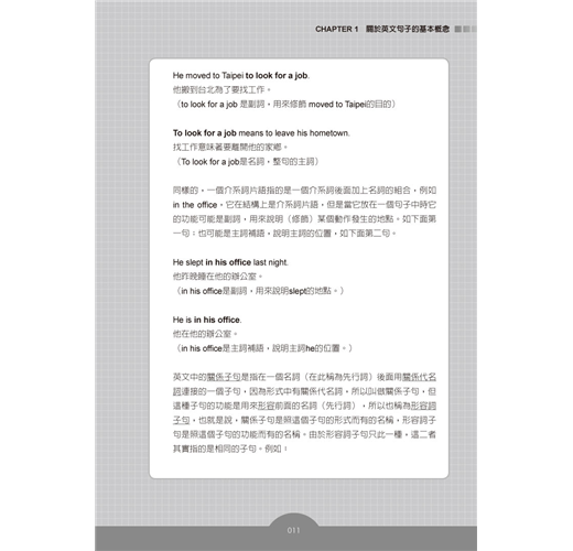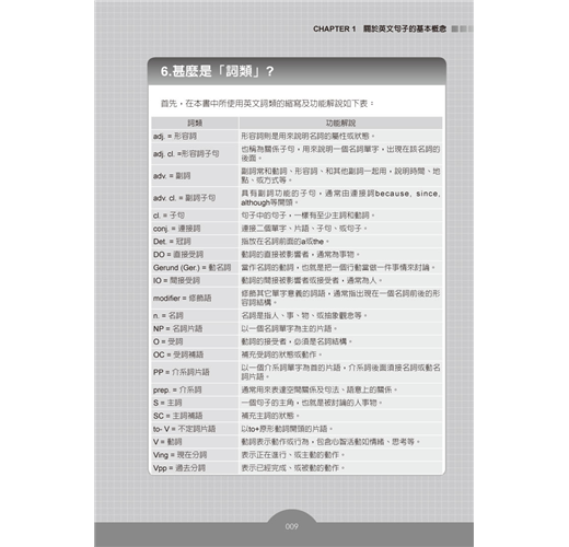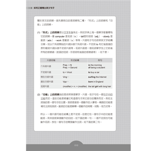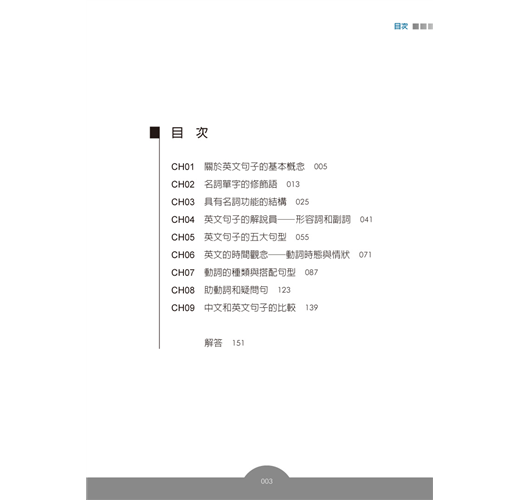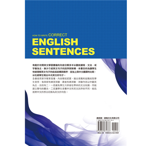 有鑑於坊間英文學習書籍的內容分類多半以聽說讀寫,文法,或字彙為主,鮮少介紹英文句子的詞序與架構,本書目的為讓學生快速理解英文句子的組成結構與順序,並加上與中文翻譯的比較,以杜絕學生寫出中式英文的句子。全書使用單字簡單易懂,內容簡短扼要,適合高職和技職校院學生使用,每章都有練習測驗,最後有總測驗,測驗內容以中翻英為主,目的有二: 一是避免學生只停留在零碎的文法知識,而能建立整句的觀念,二是讓學生查覺中文和英文詞序的不同,能迅速將中文的想法切換為英文的句型。