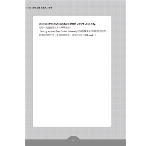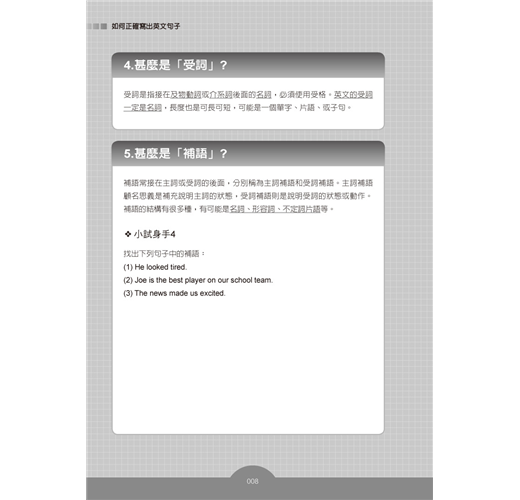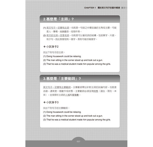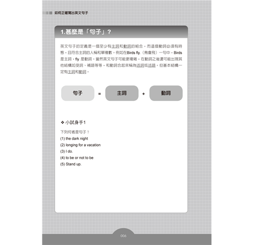 從句子的基本概念開始,深入淺出的每一步驟,教你懂得各種詞類的用法與位置,讓你熟悉五大句型、時間觀念、動詞時態變化,中文與英文句子的比較。