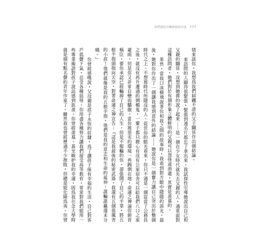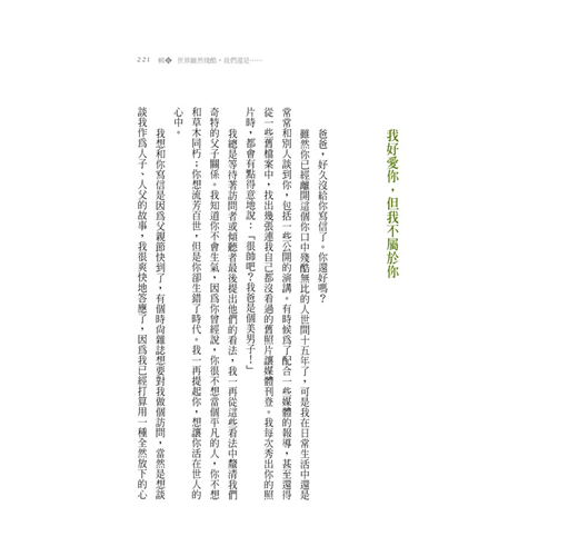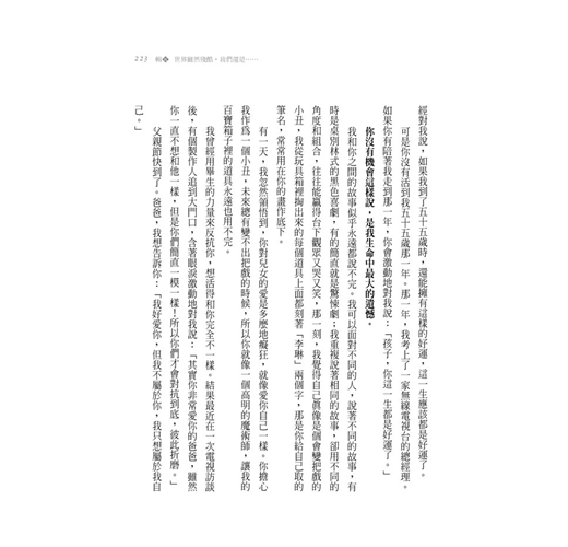 我每次都是懷著恐懼進入新的領域,不是天縱英明的,每次都很害怕的進入新的地方。克服死亡最好的方法,就是去嘗試自己沒有嘗試過的事情,發現生命是自己的。用寫作榮耀爸爸,但他還是不滿意,那我就沒有辦法了,我的生命是我的,爸爸的生命是爸爸的,我不能因為爸爸痛苦,所以不去做我想做的事情。爸爸期待的東西最後我得到了,時代變了就自然得到那個位置,但很遺憾他沒有看到。因為時代一直在變,一直鬆動,所以有機會做這些事情。