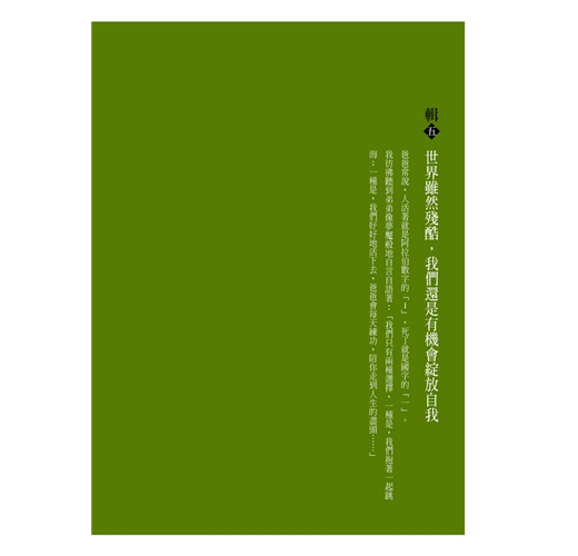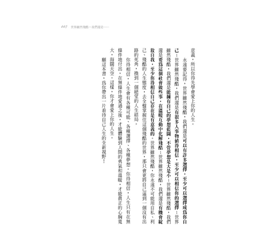 你如果告訴我說,你再也不相信這個世界是美好的,我一點也不驚訝,更不會怪你如此的負面思考、如此的消極,因為,這一切的懷疑其實都是合理的。沒有經過懷疑和反抗的天真樂觀,往往容易成為自我安慰的催眠而已,像一陣風,是留不住的。