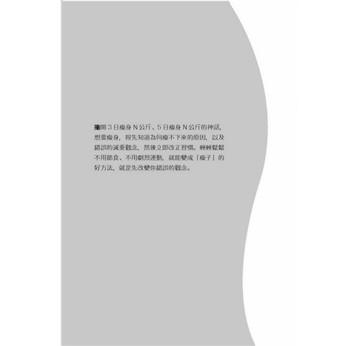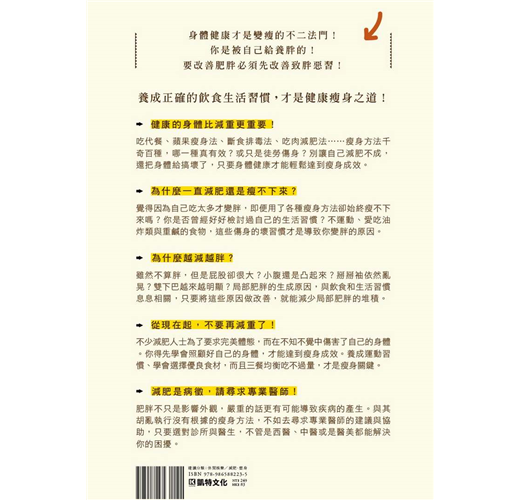 對減肥的人而言,多數人都認為是因為吃太多才變胖,而一眛地以節食做為減肥手段,除了怪罪自己吃太多之外,卻從未深刻檢討致胖的原因。體型胖瘦絕非一、兩個月就能形成,而是致胖因子所日積月累而成,你可曾想過自己的生活習慣正是身體胖瘦的關鍵?愛吃油炸和重調味的食物又不愛運動,即便使用各種千奇百怪的瘦身方法,還是無法讓自己達到纖細體型。