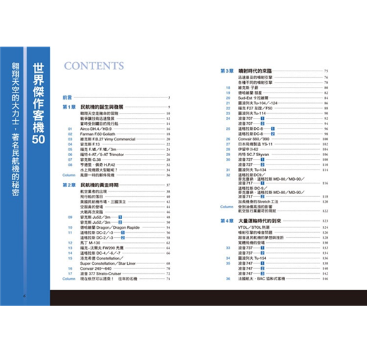 從風靡一時的往年名機,到使用最新技術的噴射客機,介紹50款與時代進步息息相關的民航機。