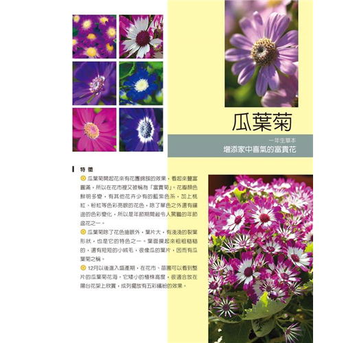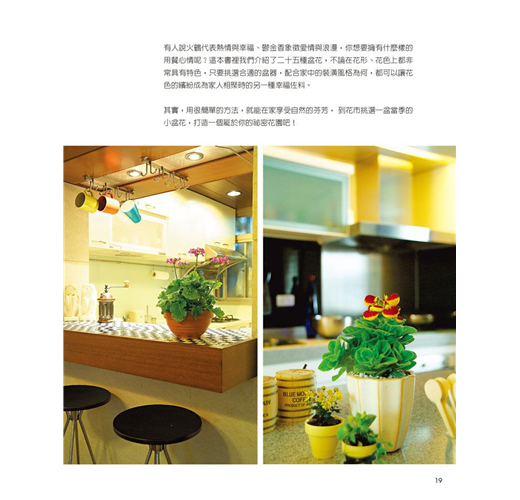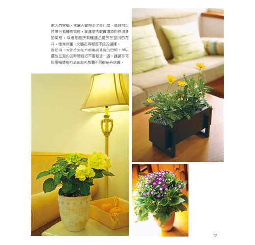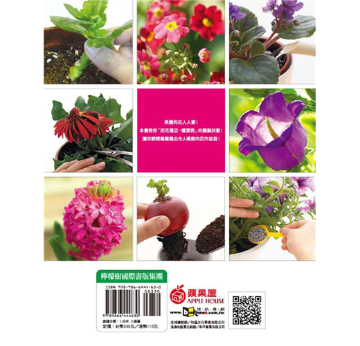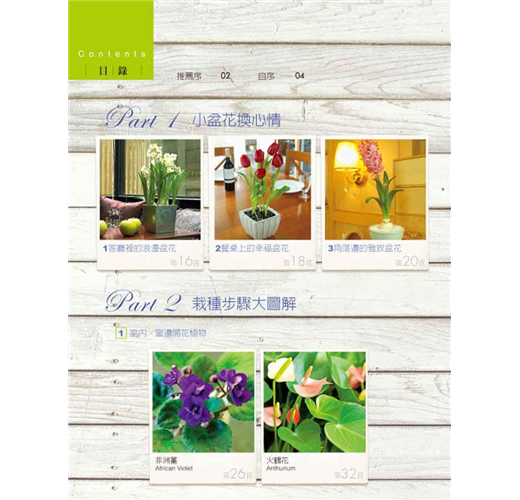 本書上百張的全彩精美圖片,閱讀起來賞心悅目,更能用之實踐於種花的每一刻,由你親手栽種的美麗的盆栽花朵,不但能佈置居家,更能改造心情,讓人感到心曠神怡。