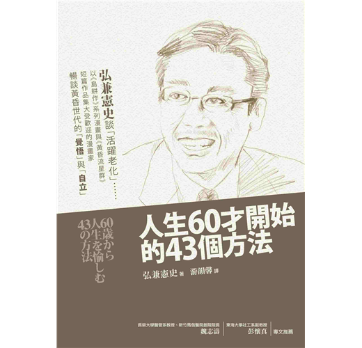 本書《人生60才開始的43個方法》涵蓋八大章節,範圍廣泛,內容卻又不失深入。書中所描述的銀髮族生活相當客觀細膩,所提供的適應方法也都具體可行,相當難得,幾乎就是現代銀髮學的楷模。照著書上所建議的去做,會愈加發現要當一個快樂的銀髮族是輕鬆地就可以達到。加以譯者游韻馨小姐的譯功一流,不會如一般日文譯本艱澀難懂,這會讓人很喜歡看,本人樂於為序。