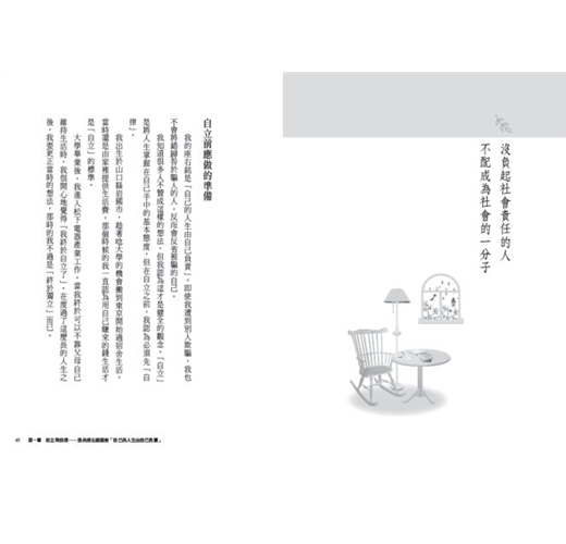 弘兼憲史過了六十歲,在這本書中好為人師的他分享了許多精彩又深刻的觀點,有如良師諄諄教導。他核心的觀念是「成為備受敬愛的老人」,首先是「自立與自律──自己的人生由自己負責」。弘兼就是如此經營人生,以超乎常人的意志力持續寫作,從事社會的關懷。在這一段中,他特別強調「自己賺錢自己花」,強調經濟的自主。