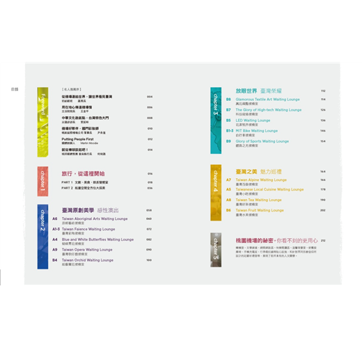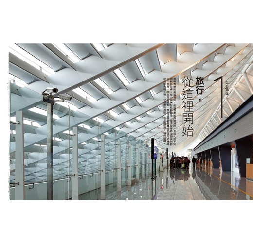 「每段旅程的起端,在遨遊天際之前,需要一處讓心靈沉澱的地方,而候機室便是歇心所在。經整建後的第一航廈呈現全新的風貌,兼融了國際觀與在地文化;本書中,我們將詳細剖析,以360度全方位導覽處處藏著驚喜的機場全景。