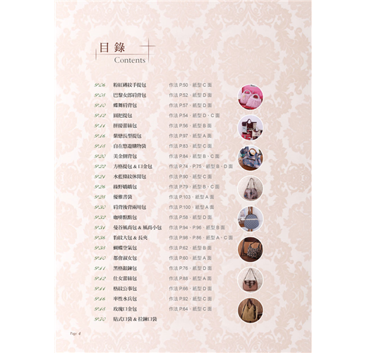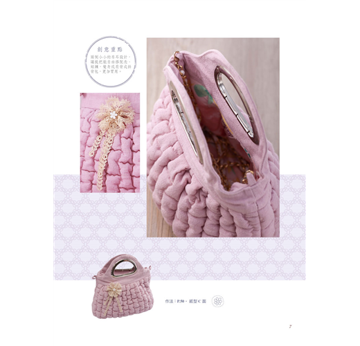 各式包款實際呈現-壓線搭配收縮襯創造出超越一般平面花樣的魅力包款。