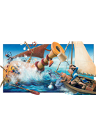 一群衣著花俏的剪刀蟲海盜駕著一艘酒瓶形狀的小船,正在追捕倒楣的燈籠魚,想搶走牠們的燈泡。
