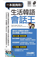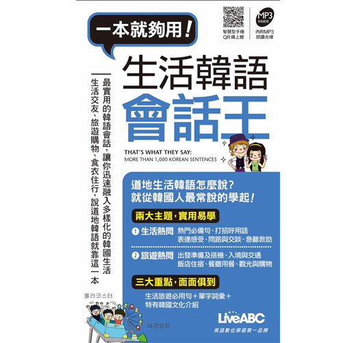 《生活韓語會話王》提供您另類的學習方法,本書分為《生活熱問》和《旅遊熱問》兩大學習重點,從中挑選出十個最重要的情境主題,包括:打招呼用語、問路與交談、急難救助、搭機、飯店住宿、餐廳用餐、觀光購物等等實用的主題,一共精選了數百句最實用的韓語句子,貼近生活、符合實際需要,是一本可以輕鬆學習、又方便查詢即時想要句子的韓語工具書。