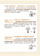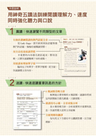 作者用書中每篇文章內容示範速讀技巧,透過略過6種不重要的詞類,分析文章中重要與不重要的訊息,讓讀者一看到<介系詞+名詞>、<副詞>等組合就先快速略過,精準選讀重點。下次看到長篇文章,別人還在想「這個單字是什麼?」時,你已經可以做心得分享了。