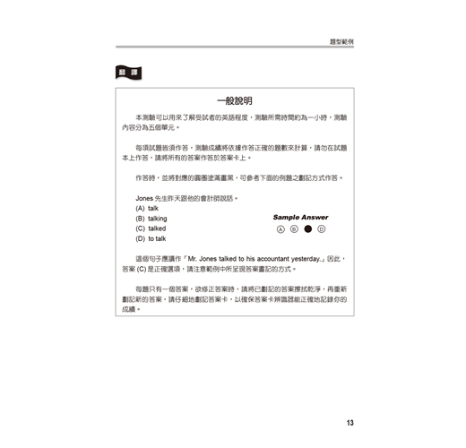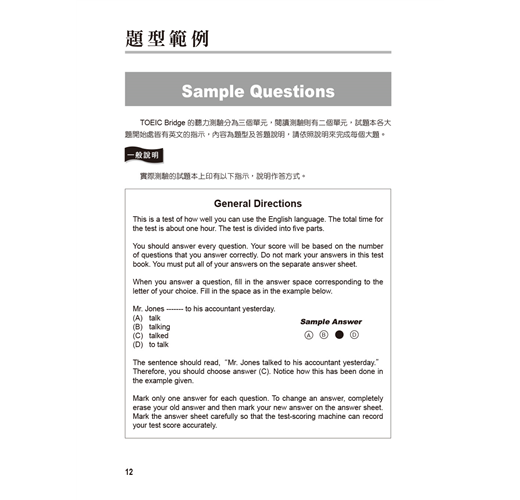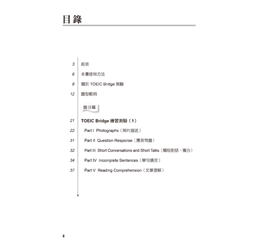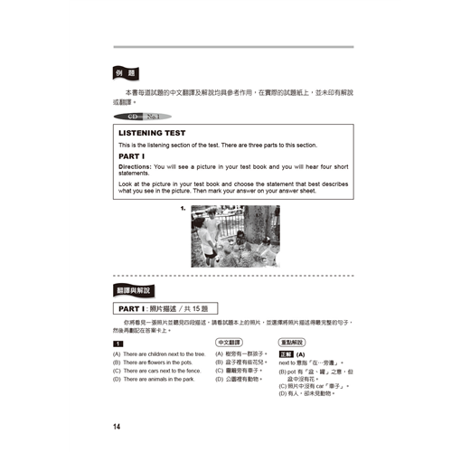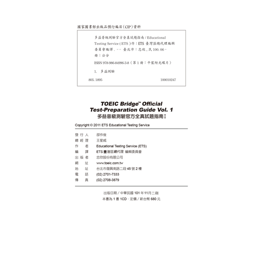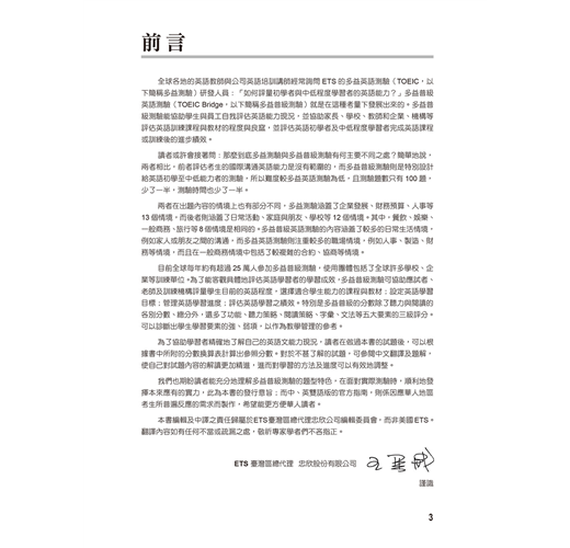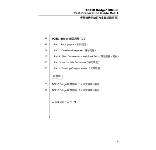 中英雙語版的官方試題指南係因應華人地區考生普遍反應需求所製作,祈考生能更方便地熟悉題型、練習與查考,對於不甚了解的試題,也可在參閱翻譯及題解後,使自己更加精進,進而對英語學習的方法及進度做有效的調整。