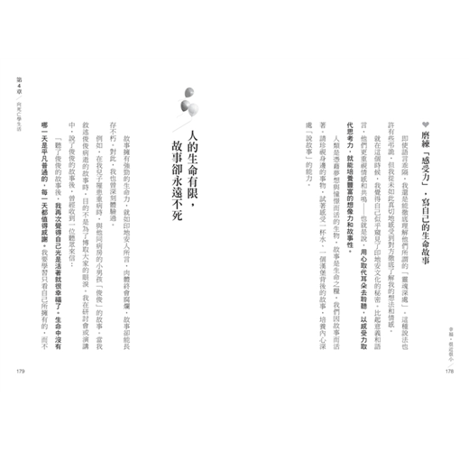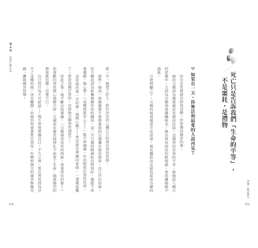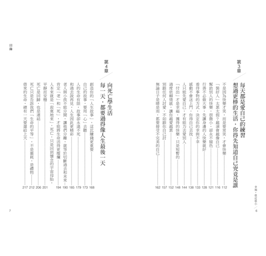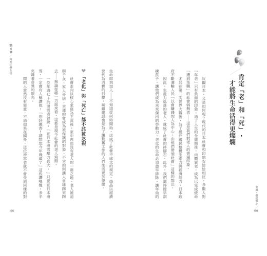 許多人迴避生命終點的話題,是因為捨不得放棄活著的喜悅。這不正好說明一件事嗎?生與死是一體的兩面,有生必有死,思考死亡等同於思考活著。如果我們無視死亡,只會讓生命變得稀薄,不懂替自己的人生創造價值,也不知道活著有多麼珍貴。