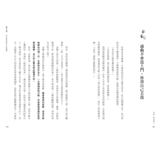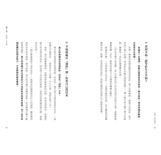 無論是什麼,一旦得到,似乎就不再美好,那麼,究竟該如何才好?作者認為應該先認清一個事實:真正的幸福不是獲得結果,而是朝著目標不斷前進的「過程」。「與其穿戴珠寶,不如在餐桌上裝飾花朵」,不要貪求被大量物質環繞的龐大幸福,將目光放在就算缺乏物質,心靈依舊平安的微小幸福上。一旦了解這一點,你就不會陷入幸福的矛盾裡。