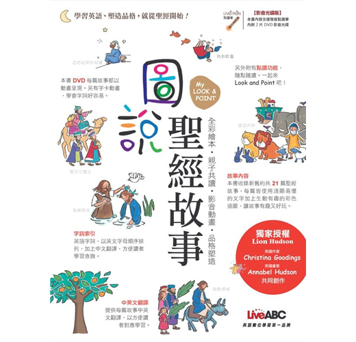 『My Look and Point 圖說聖經故事』內容包含舊約與新約聖經,共有21篇聖經故事、1篇耶穌教的禱告文、1篇小牧羊人的詩篇,還可以搭配DVD影音光碟並支援中英語切換點讀筆使用學習。藉由淺顯易懂的文字、彩繪圖像插圖、數位影音與點讀筆功能等多元化學習,進而讓聖經的話語豐豐滿滿地在孩子的心中成長茁壯。
